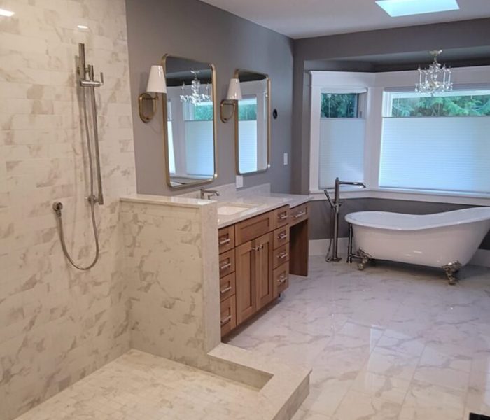 This full bathroom remodel in Fall City includes updated flooring, double sinks, and a freestanding tub. The design combines modern finishes with practical storage, enhancing both style and convenience.