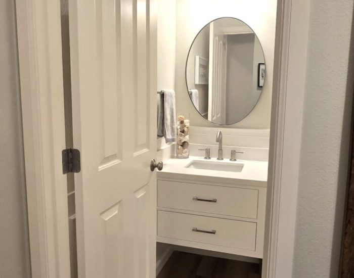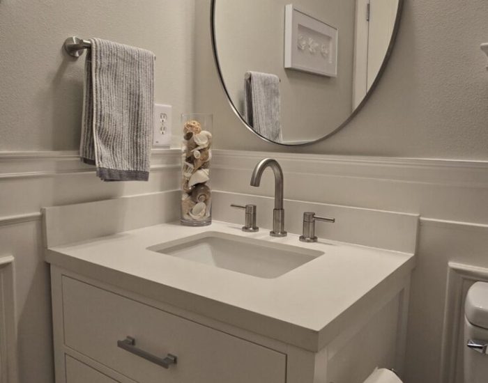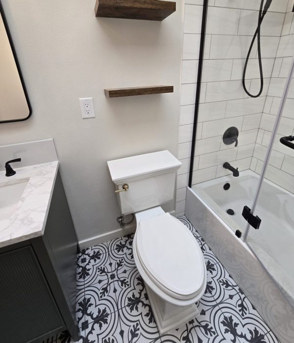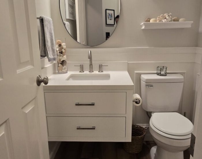 A compact powder room update featuring modern fixtures and a floating vanity. This remodel maximized the small space’s impact while improving usability and aesthetic appeal.